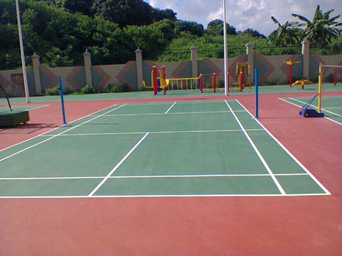 4、面層一: 用丙烯酸色層基礎材料加入適當的石英砂攪拌混和鋪成,摻入石英砂可增強球場表面耐磨性,而且也可以根據用量的多少來調節控制球速的快慢。